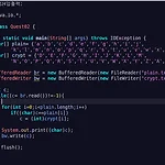 으음.. i/o 가 인제 좀 보인다..ㅎㅎ package 챕24입출력; import java.io.BufferedReader; import java.io.BufferedWriter; import java.io.FileReader; import java.io.FileWriter; import java.io.IOException; public class Quest05 { public static void main(String[] args) throws IOException{ //문자열 읽어오는 스트림 열기 BufferedReader br = new BufferedReader(new FileReader("input.txt")); BufferedReader br2 = new BufferedReader(new F..